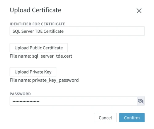 To add a TDE certificate, use the Upload Certificate dialog either when creating a new SQL Server location (Step 4 - Configure Capture/Integrate for SQL Server Location) or when editing source and target properties of an existing SQL Server location.When creating a new SQL Server location, add the TDE certificate as follows: