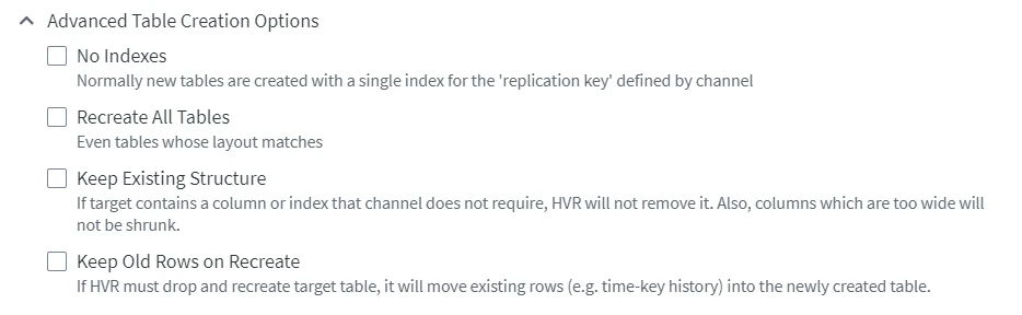 This option is enabled only when Only Create Target Tables that are Missing or Create Missing Target Tables and Alter or Recreate Tables with Incorrect Layout is selected. ![]() |