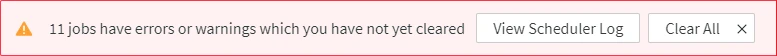 | RECENT ERRORS | The time when the most recent error occurred. If there are any job errors or warnings, the following notification is displayed at the top of the page. Click the View Scheduler Log button to open the Log Viewer dialog displaying information about all the job errors on the hub. Click the Clear All button to hide all the current errors and warnings from the page. After clearing the errors and warnings, only new ones will be displayed in the RECENT ERRORS column from now on.