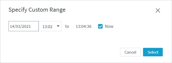 Number UI Element Description 1 Scope Allows to inspect historical metrics for a specific channel, location or table. 2 Graph Range Allows to select a time period, for which metrics are shown. You can select the time range from the available ones (such as 'Last 10 min' or 'Last 7 days') or you can specify a custom time range by clicking Specify range and selecting the start date/time and end date/time in the Specify Custom Range dialog.